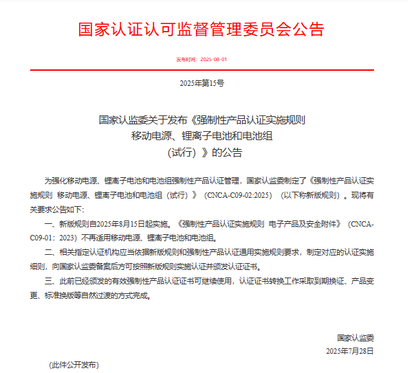 2025年8月15日开始,依据国家认证认可监督管理委员会制定的《强制性产品认证实施规则 移动电源、锂离子电池和电池组(试行)》(CNCA-C09-02:2025),将对充电宝、锂离子电池和电池组实施新的强制性产品认证实施规则。