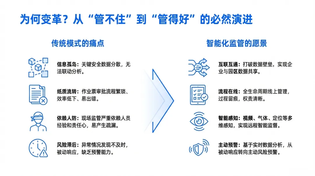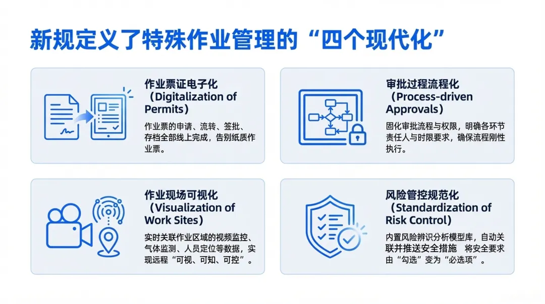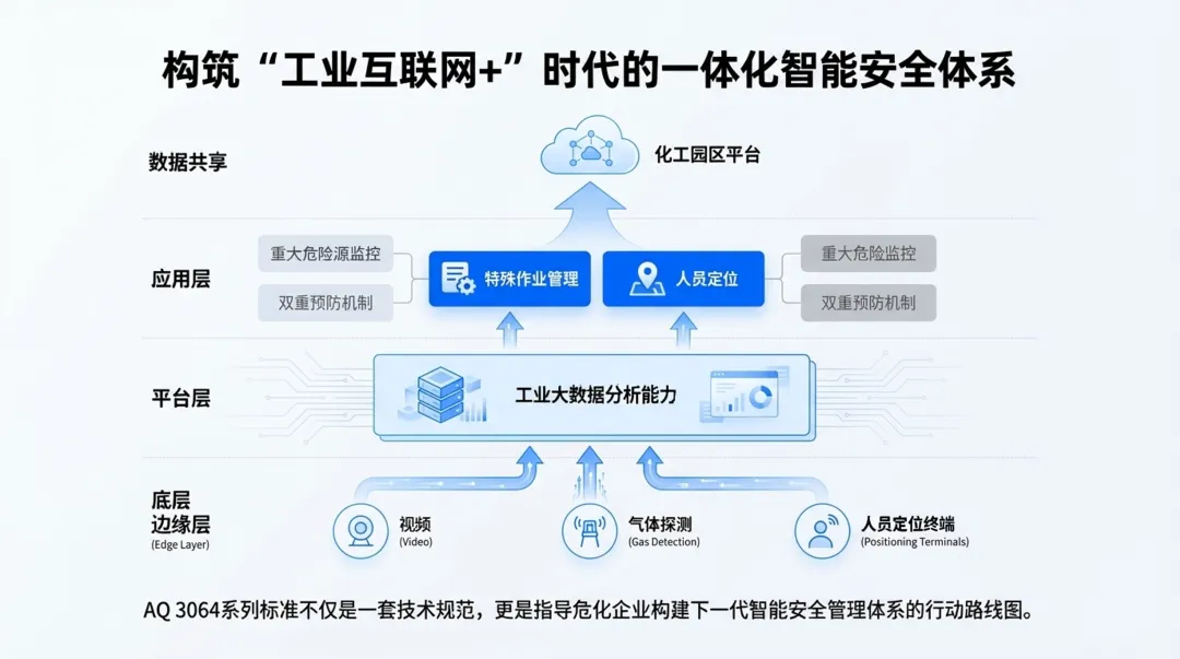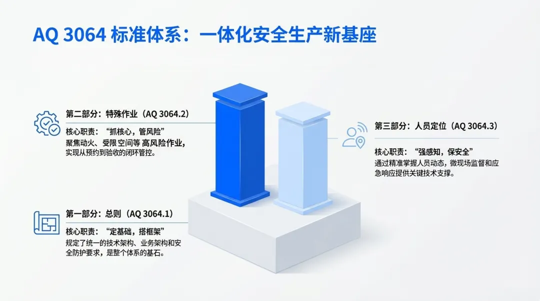 传统危化安全生产模式长期面临信息孤岛、流程繁琐、依赖人防、风险滞后等痛点,安全管理效率与精准度难以满足行业高质量发展需求。AQ 3064 系列标准的出台,从总则、特殊作业、人员定位三大核心维度搭建起一体化安全生产新基座,为行业变革提供了明确的技术与业务框架。
