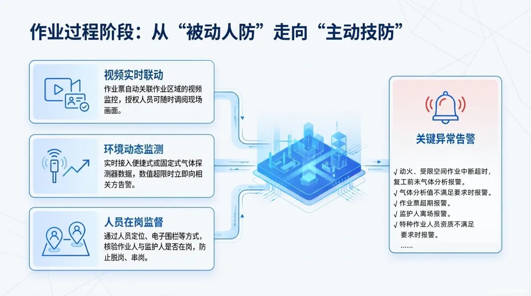 公司紧跟标准导向,打造的智能安全管理系统深度契合AQ 3064.1总则的基础要求,确立统一技术架构与安全防护体系;聚焦AQ 3064.2特殊作业管理核心,实现动火、受限空间等高风险作业 “四个现代化” 升级 —— 作业票证电子化、作业现场可视化、审批流程化、风险管控规范化,构建从线上预约、风险辨识、全流程审批、现场核查,到作业过程监控、闭环验收、数据分析的全生命周期管理闭环。通过视频实时联动、环境动态监测、人员在岗监督、关键异常告警等技术手段,将作业过程从 “被动人防” 推向 “主动技防”,有效规避脱岗、串岗、资质不符、气体超标等安全隐患。