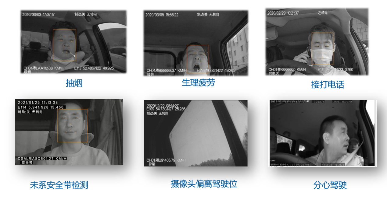 实时检测疲劳驾驶(如闭眼、低头打盹)、打电话、双手脱离方向盘、不系安全带等危险行为;