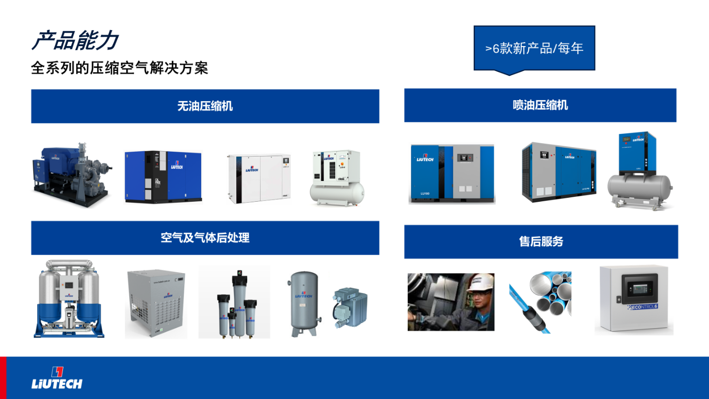 目前,柳泰克已构建起涵盖**喷油螺杆压缩机、无油旋齿、无油涡旋、离心压缩机**等全系列产品线,并配套**冷干机、吸附式干燥机、过滤器及冷凝水处理装置**等后处理设备,形成完整的压缩空气系统解决方案。依托五大制造中心和强大的研发能力,柳泰克每年推出超过6款新产品,持续满足中国市场多样化、高标准的需求。
