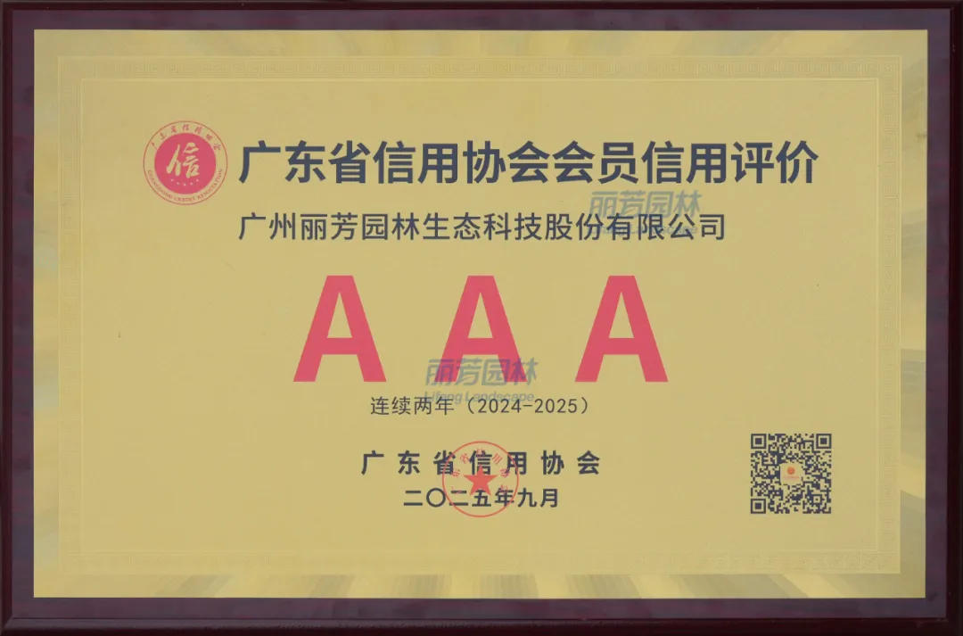 创业于1999年,已在园林绿化领域深耕26年的丽芳园林,能够跨越多个经济周期而持续经营,本身即依赖于稳定的合规框架和契约履行能力。此前,丽芳园林还凭借诚信经营,获广东省信用协会会员AAA级信用评定,也反映了其在当前更严标准下的信用实力。
