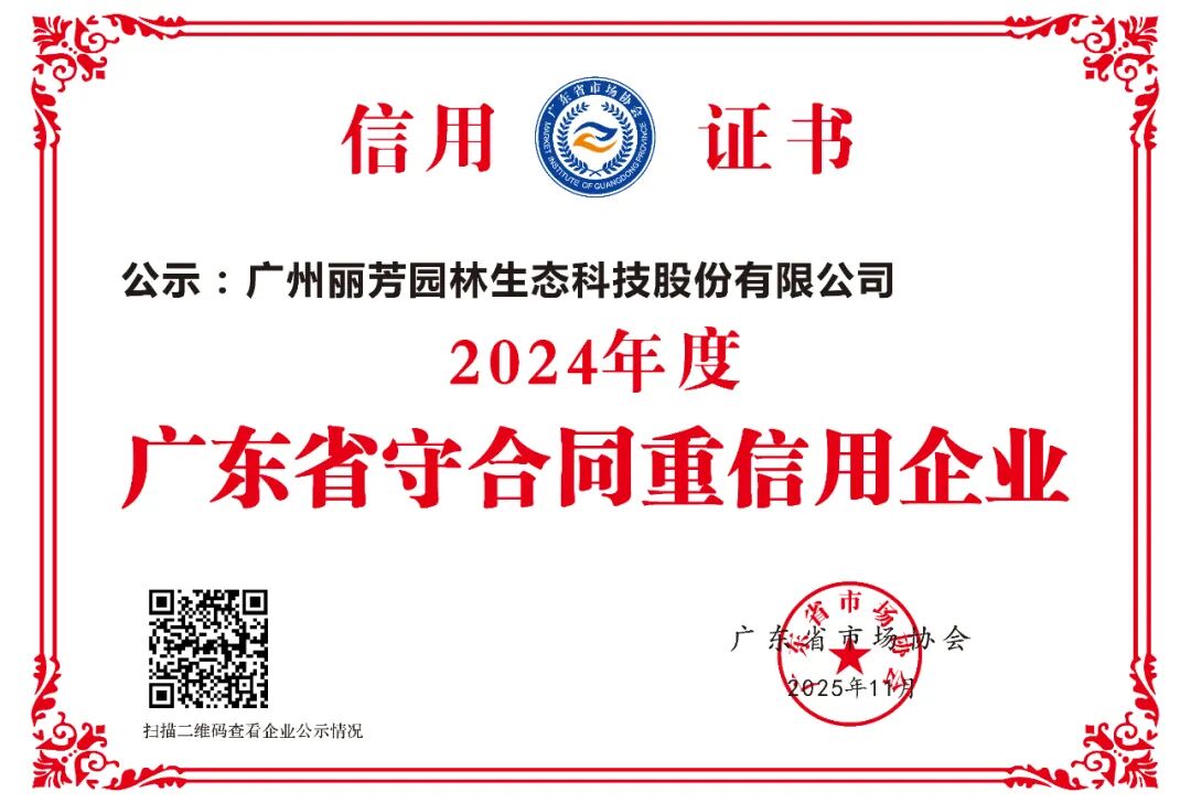 近日,广东省市场协会正式公布了2024年度第二批“守合同重信用企业”评定结果。丽芳园林凭借卓越的合同管理能力和始终如一的诚信经营理念,成功蝉联此项荣誉——这已是公司第13次获此殊荣,并同步荣获2024年度广东省诚信经营企业信用证书。