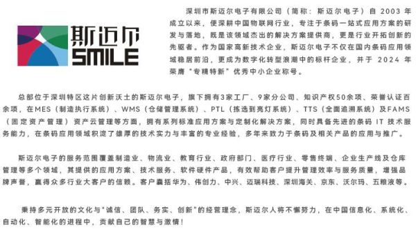 一答:这句愿景是我们对外的价值宣言,但从企业存在的核心意义来看,我们更倾向于将其落脚到“为用户创造可持续价值链接”上。斯迈尔电子自2003年成立便扎根物联网条码应用领域,我们始终认为,技术只是服务客户的工具,而非最终目标。因此,我们坚持长期主义的务实路线,先潜心打磨企业内功——包括技术研发、团队建设、服务体系完善等,再循序渐进推动行业价值落地,而非空谈“改变世界”的宏大目标。