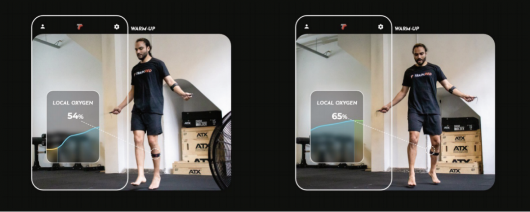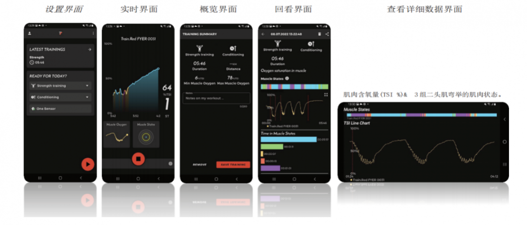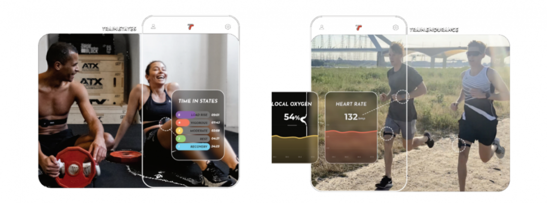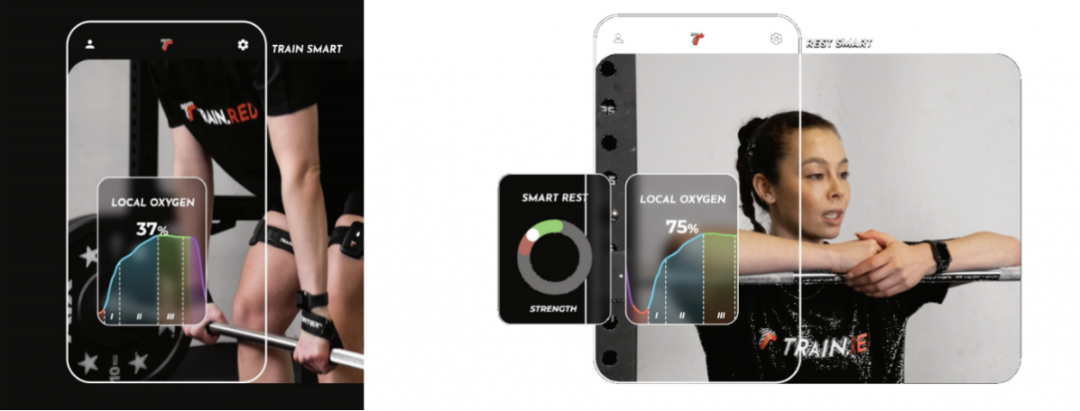 TRAIN RED可穿戴肌氧监测设备采用人工智能技术和用户图形交互界面,将肌肉组织中的氧饱和度和脱氧合血红蛋白的变化通过可视化界面的方式呈现实时关键数据,帮助用户更好地提升运动表现。